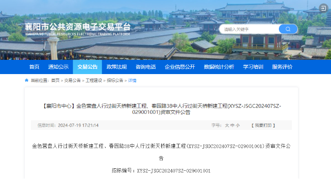 近日,襄陽市公共資源交易網發布金色營盤人行過街天橋新建工程、春園路38中人行過街天橋新建工程資審文件公告!