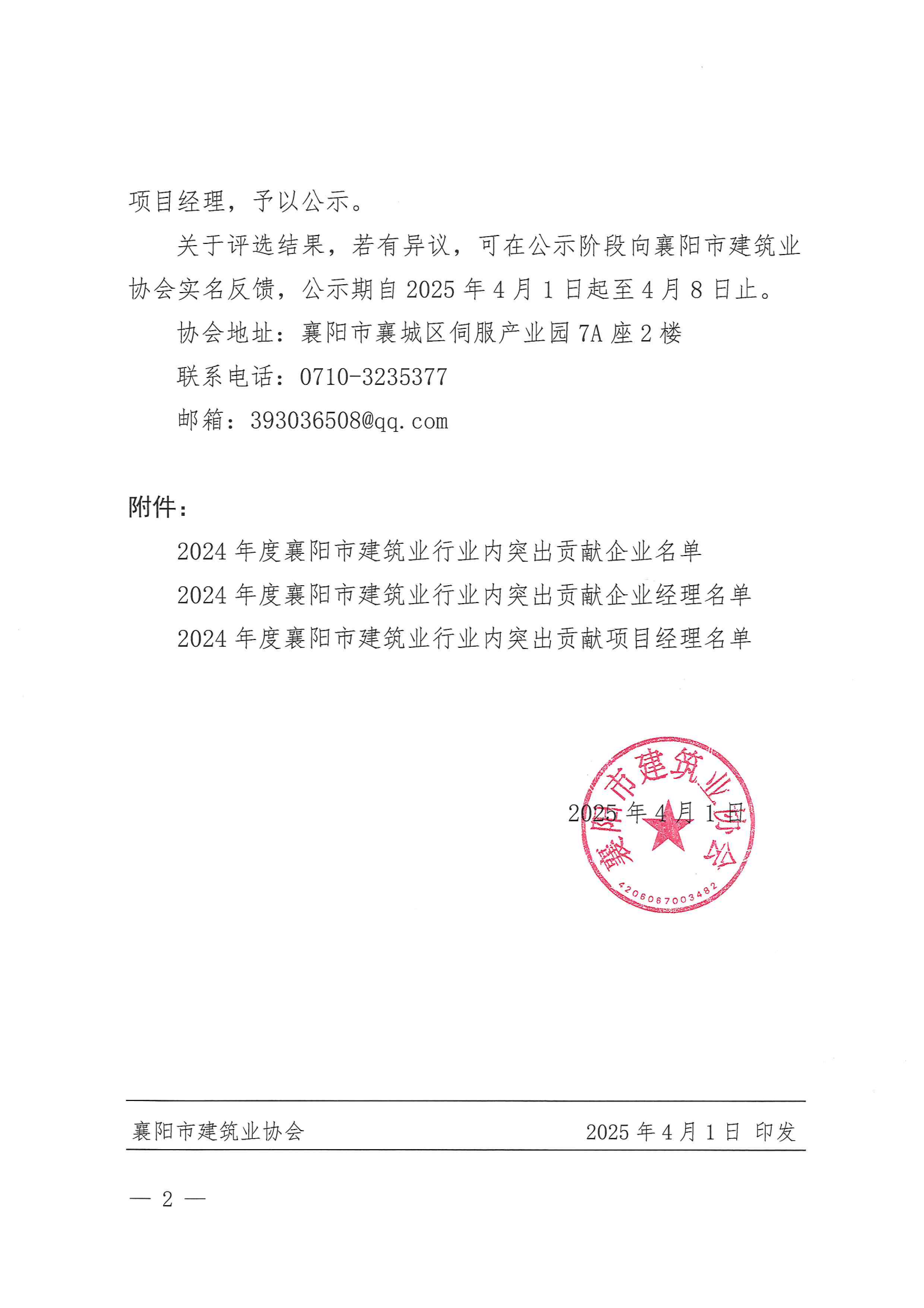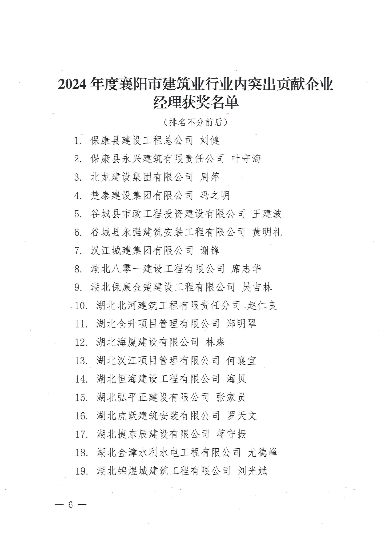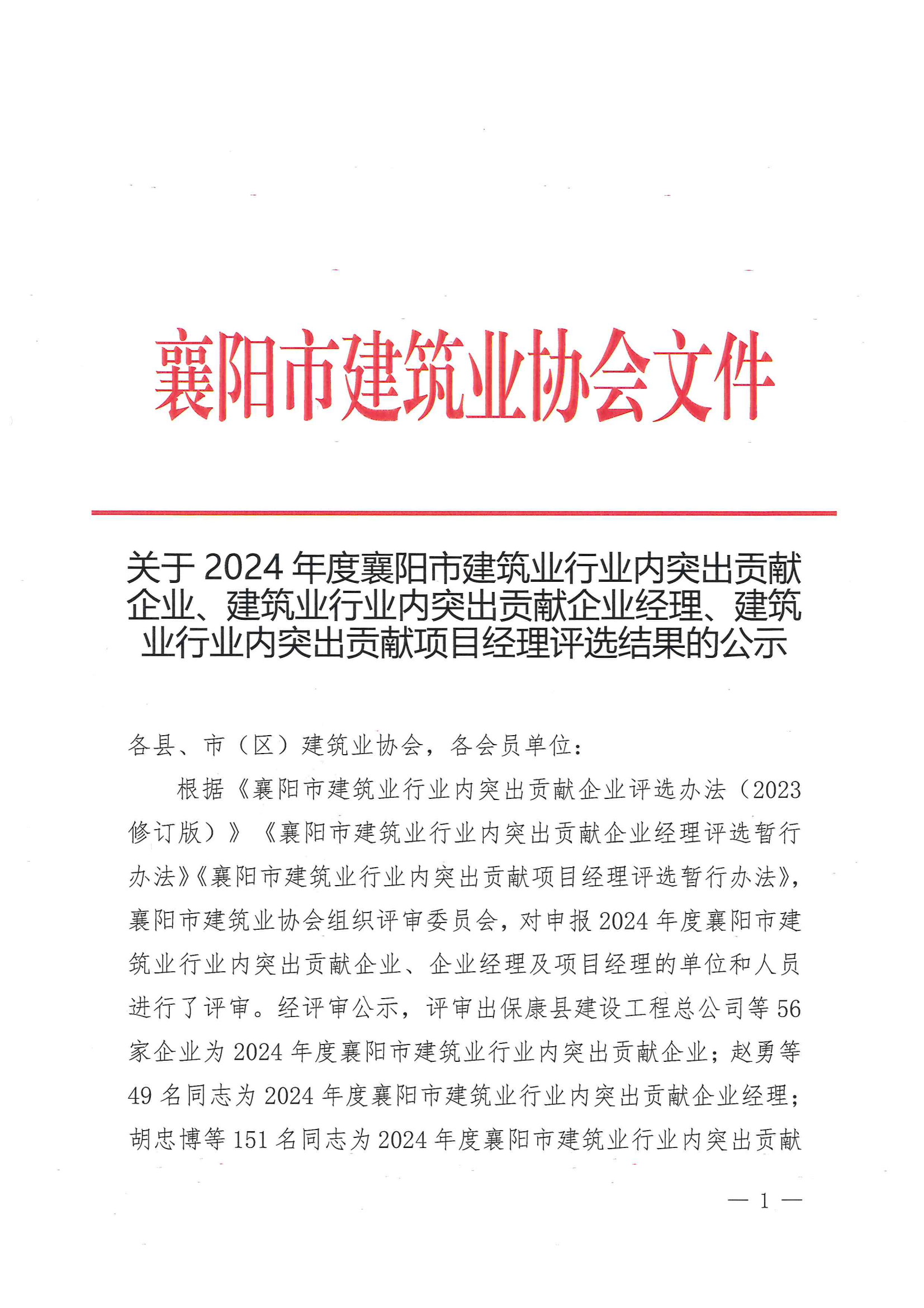 關(guān)于2024年度襄陽市建筑業(yè)行業(yè)內(nèi)突出貢獻企業(yè)、建筑業(yè)行業(yè)內(nèi)突出貢獻企業(yè)經(jīng)理、建筑業(yè)行業(yè)內(nèi)突出貢獻項目經(jīng)理評選結(jié)果的公示